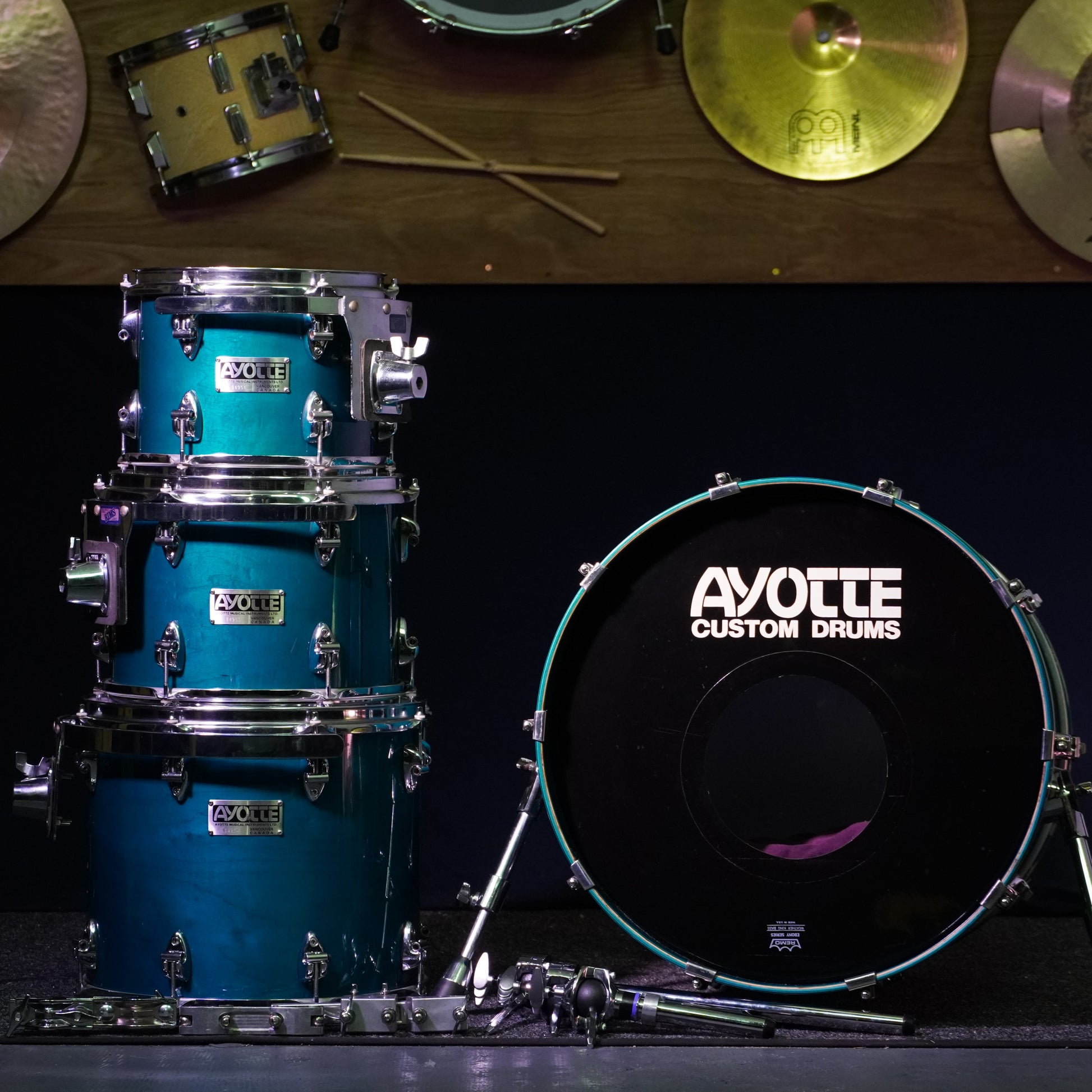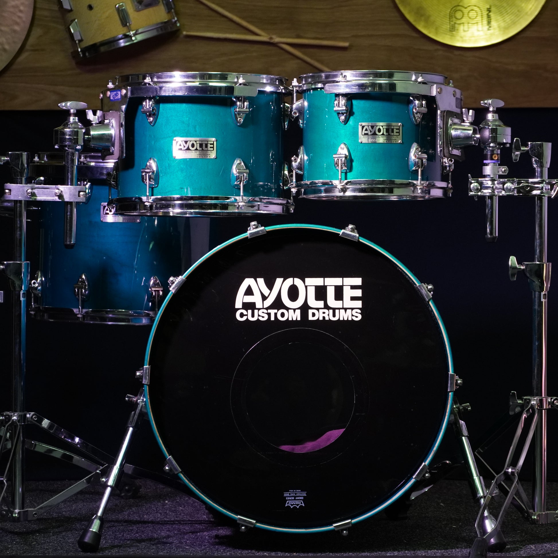A true hidden gem from the Ray Ayotte era, this late-1980s Ayotte kit was handmade in Vancouver, Canada, during the brand’s most respected period. Finished in a gorgeous Blue Transparent lacquer, the maple grain glows beautifully under light and gives the kit a premium boutique look that’s every bit as striking in person as it is in photos. The shells themselves are beautiful, some of the smoothest, most perfectly cut maple shells you’ll ever feel, complete with crisp reinforcement rings and exceptional build quality throughout.