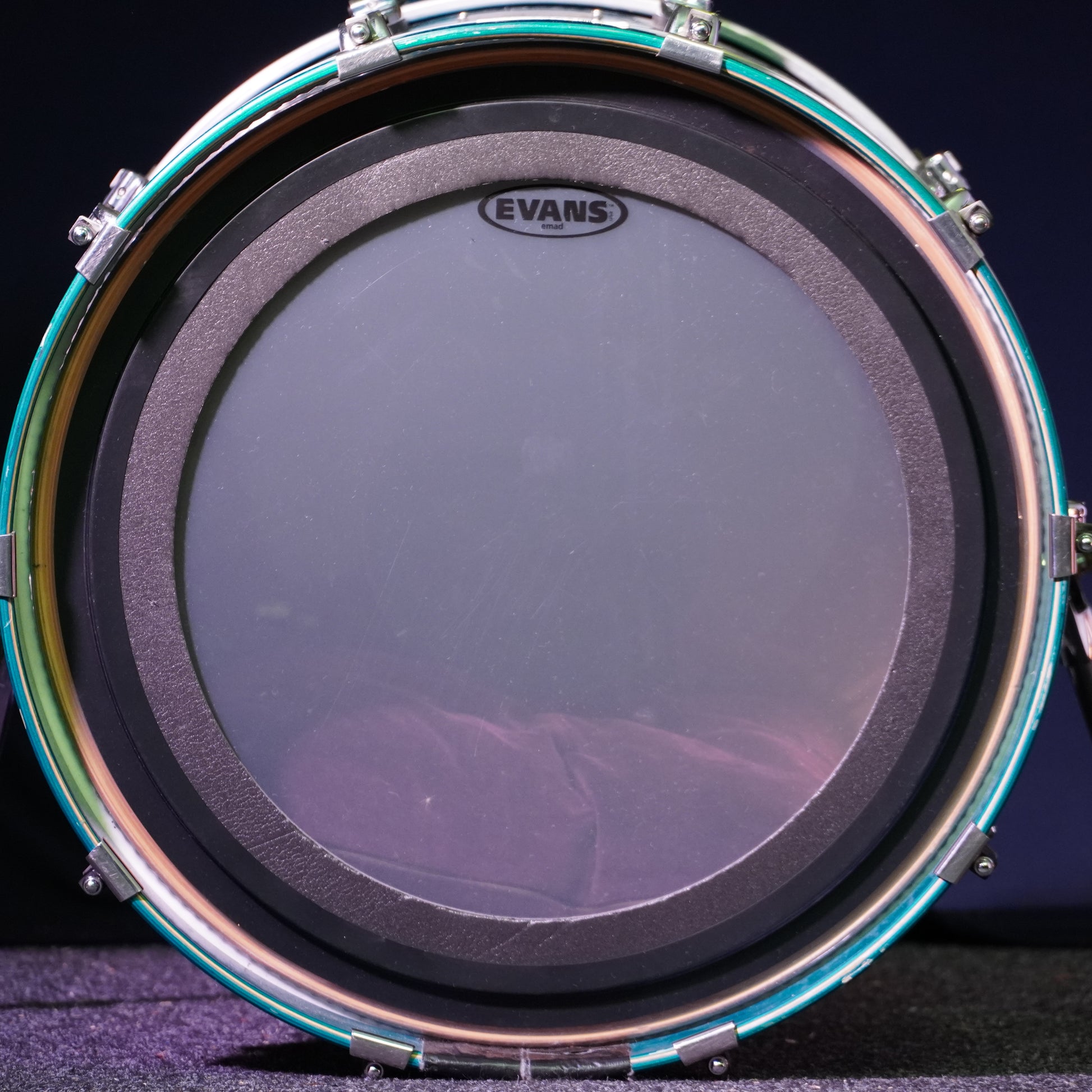 The kick drum is fitted with an Evans EMAD Clear batter head which is in excellent condition showing few signs of use. The resonant side is fitted with the Ayotte branded head.