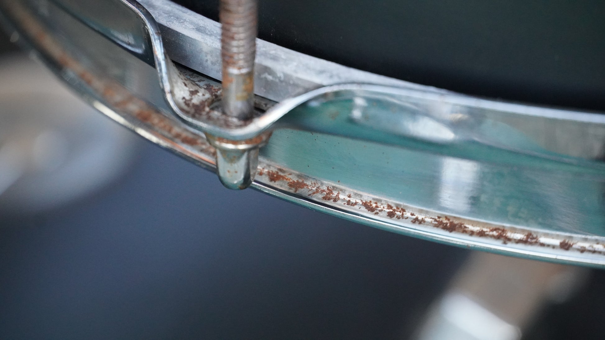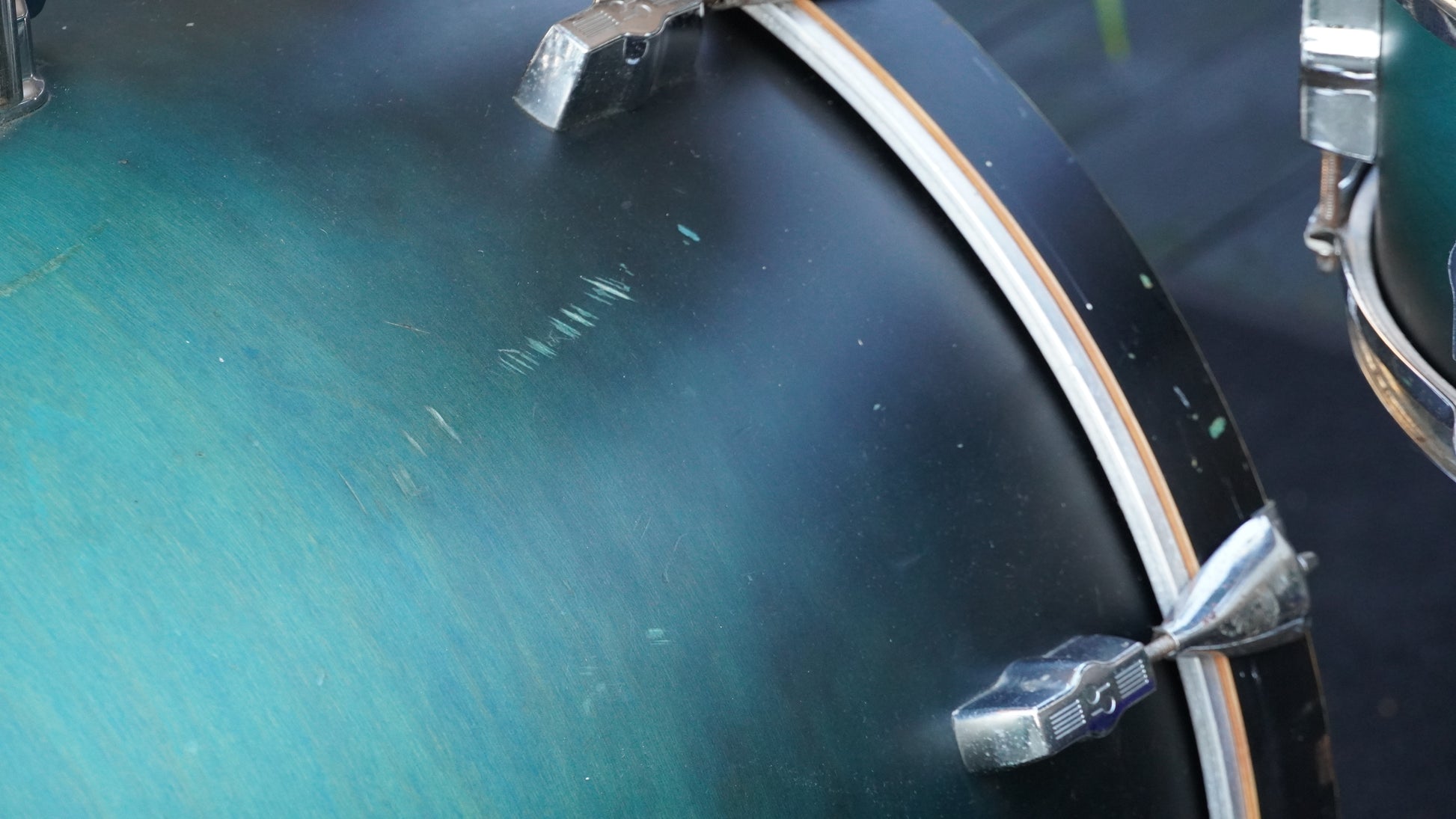 This kit is in good condition however a fair amount of the chromework on the hoops, lugs, and holders have suffered with rust. This kit has been completely stripped down and cleaned however it is still present in certain areas. Fortunately, this doesn't affect the sound of the kit in any way. There are some small dinks and scuffs on the shells themselves but mainly on the bass drum and floor tom. These also will not affect the sound of these drums as they are on the outside of the shells only. The left kick drum leg is missing the rubber foot but the spike is still there.