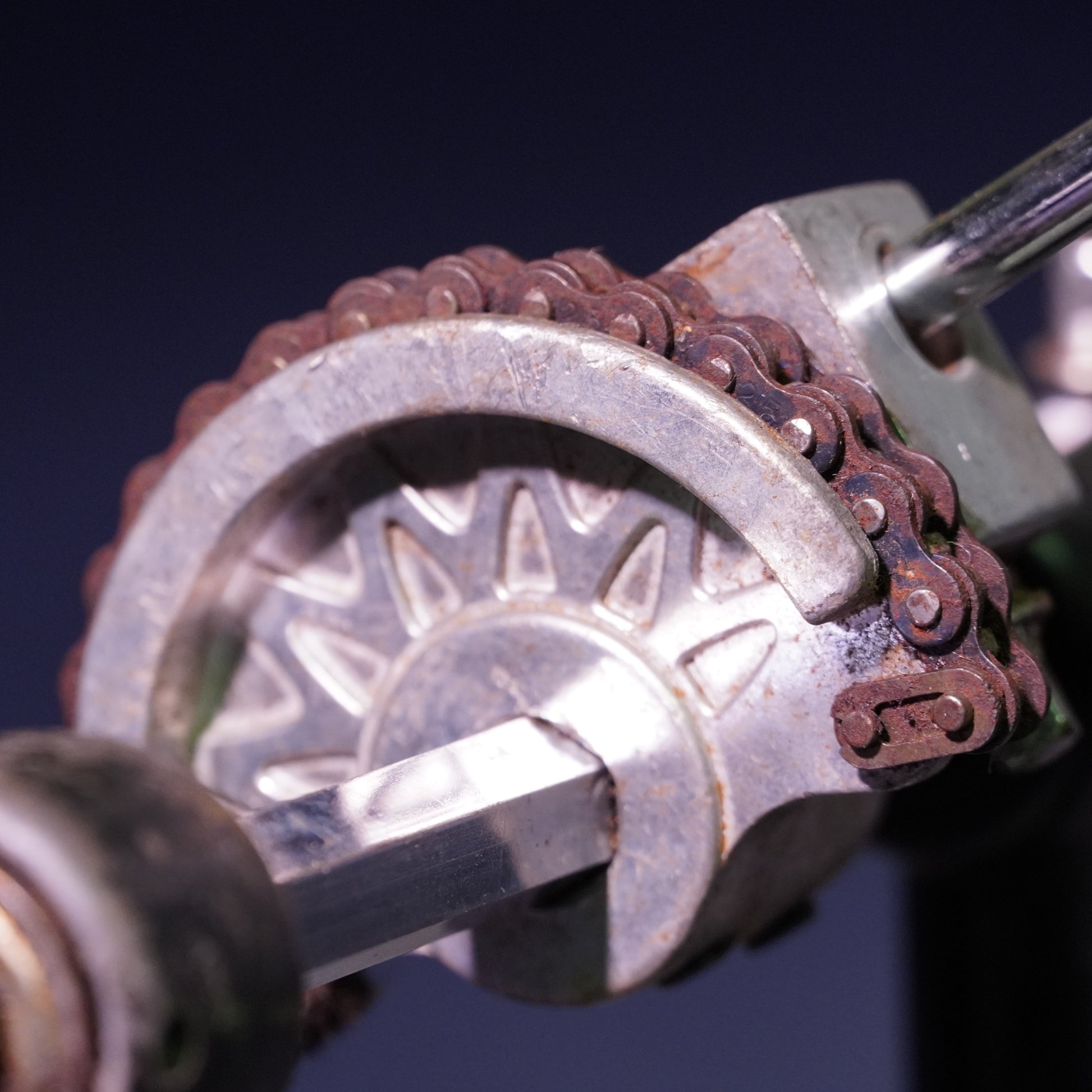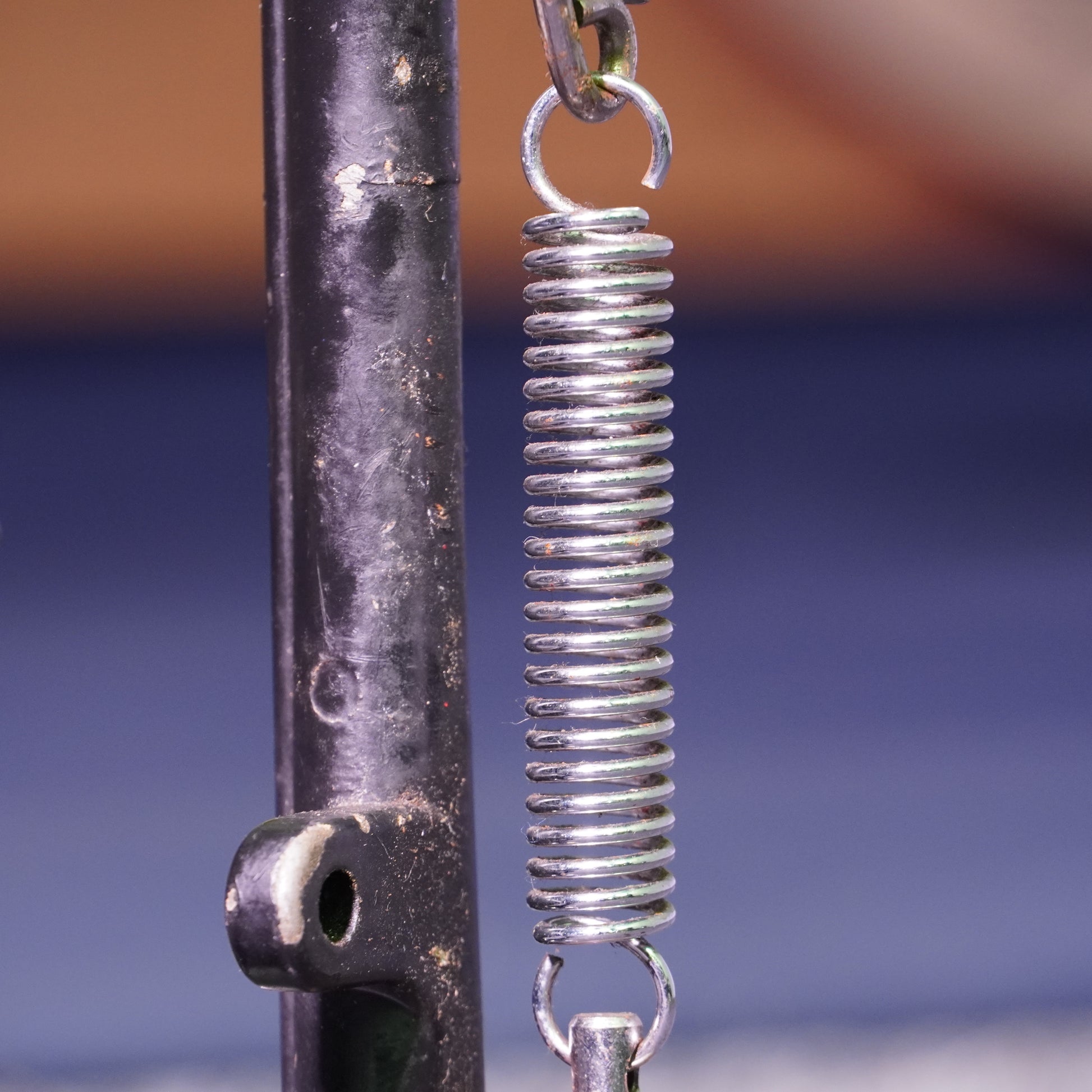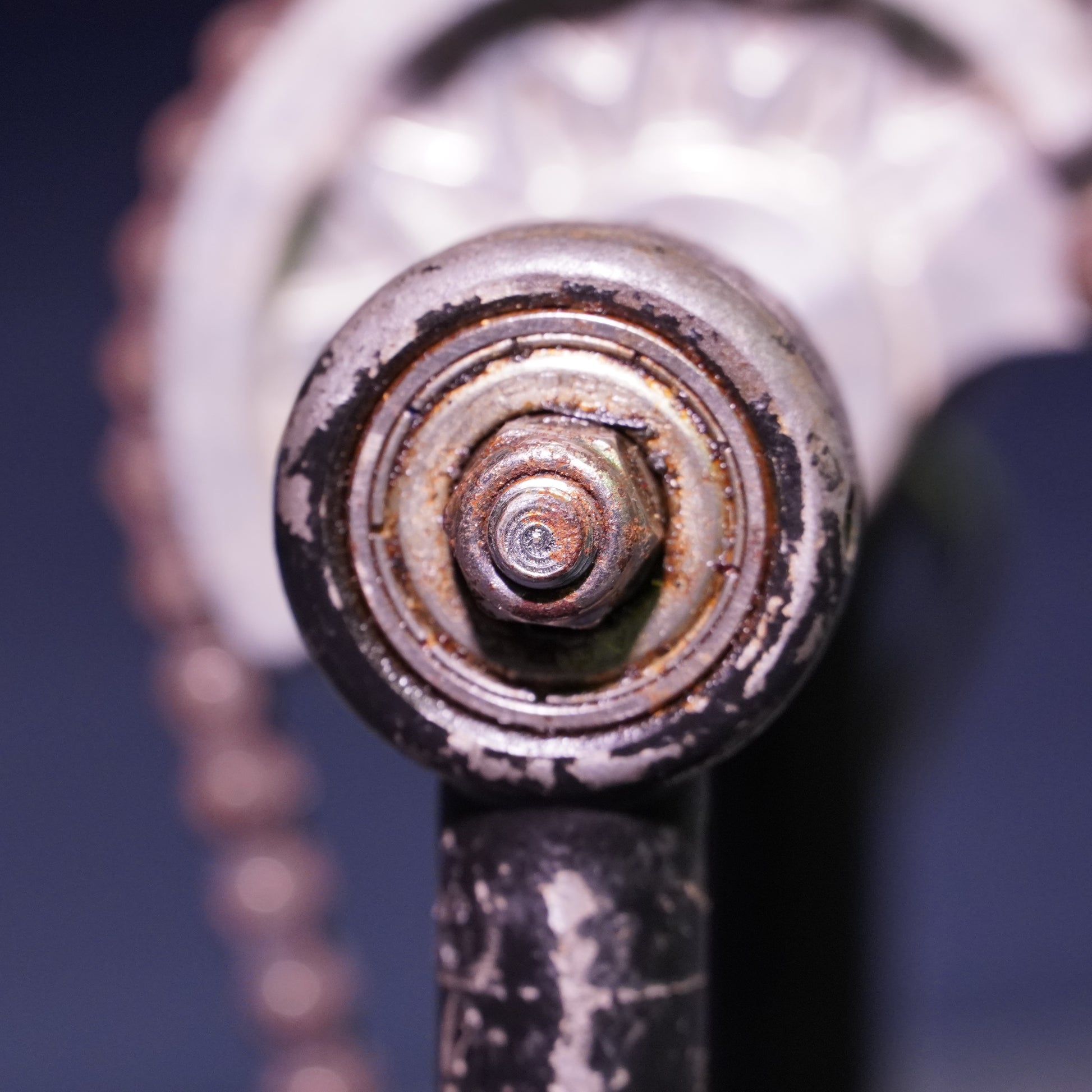 This pedal is in fair condition showing clear cosmetic wear. There’s visible rust on several components, paint loss and pitting to the footboard and frame, and light corrosion around the cam and linkage. The pedal remains fully functional with smooth action and a strong spring.