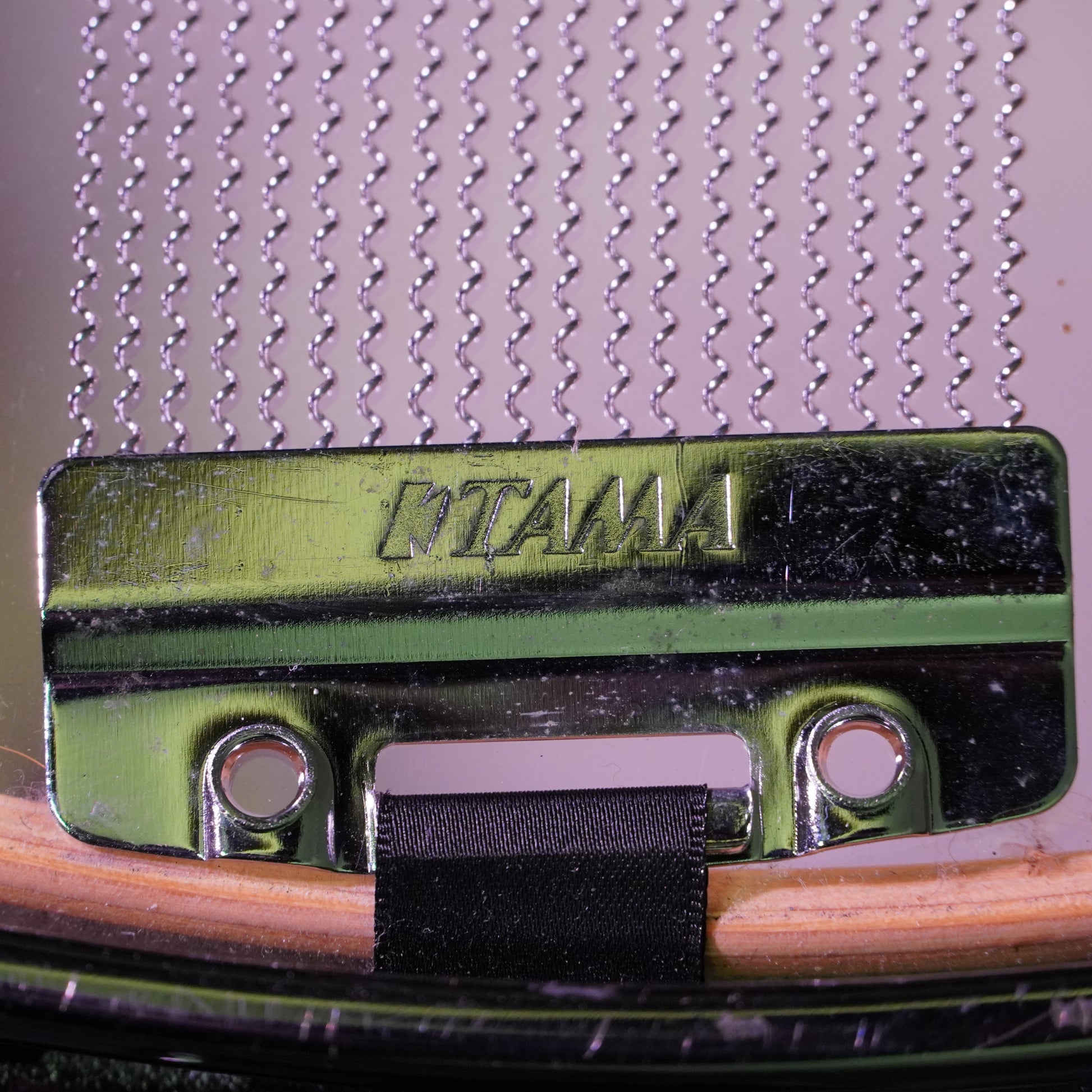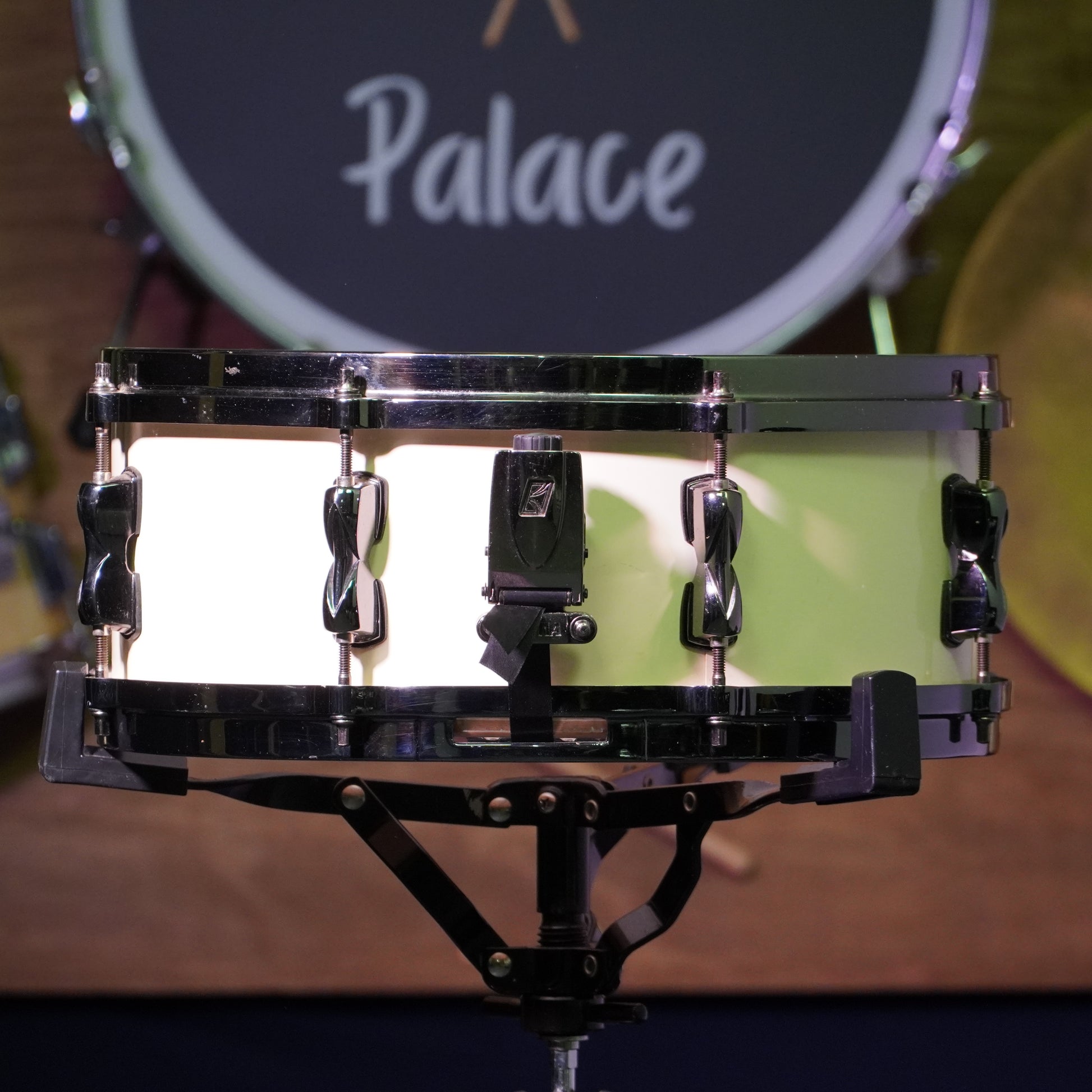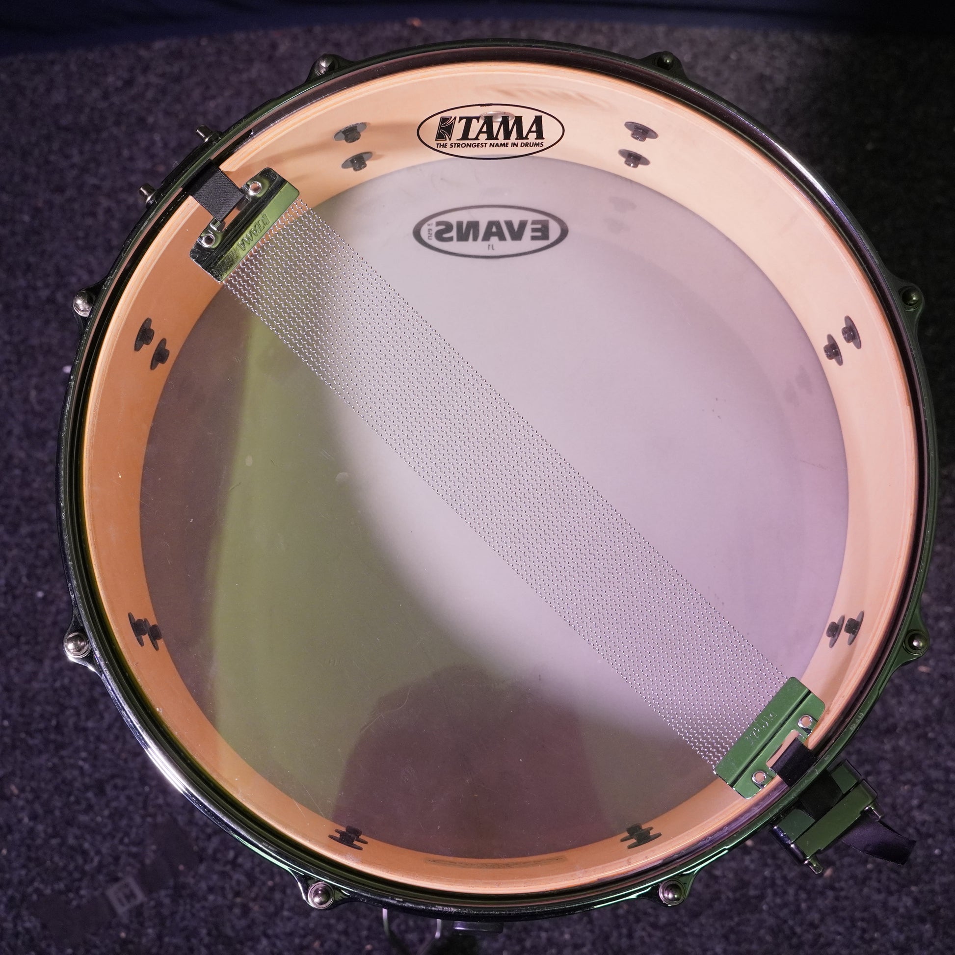This snare is in great condition overall with some minor cosmetic wear on the hardware, mainly small scuffs and a bit of edge pitting. The shell and wrap are clean with no cracks or damage, and all parts function smoothly.